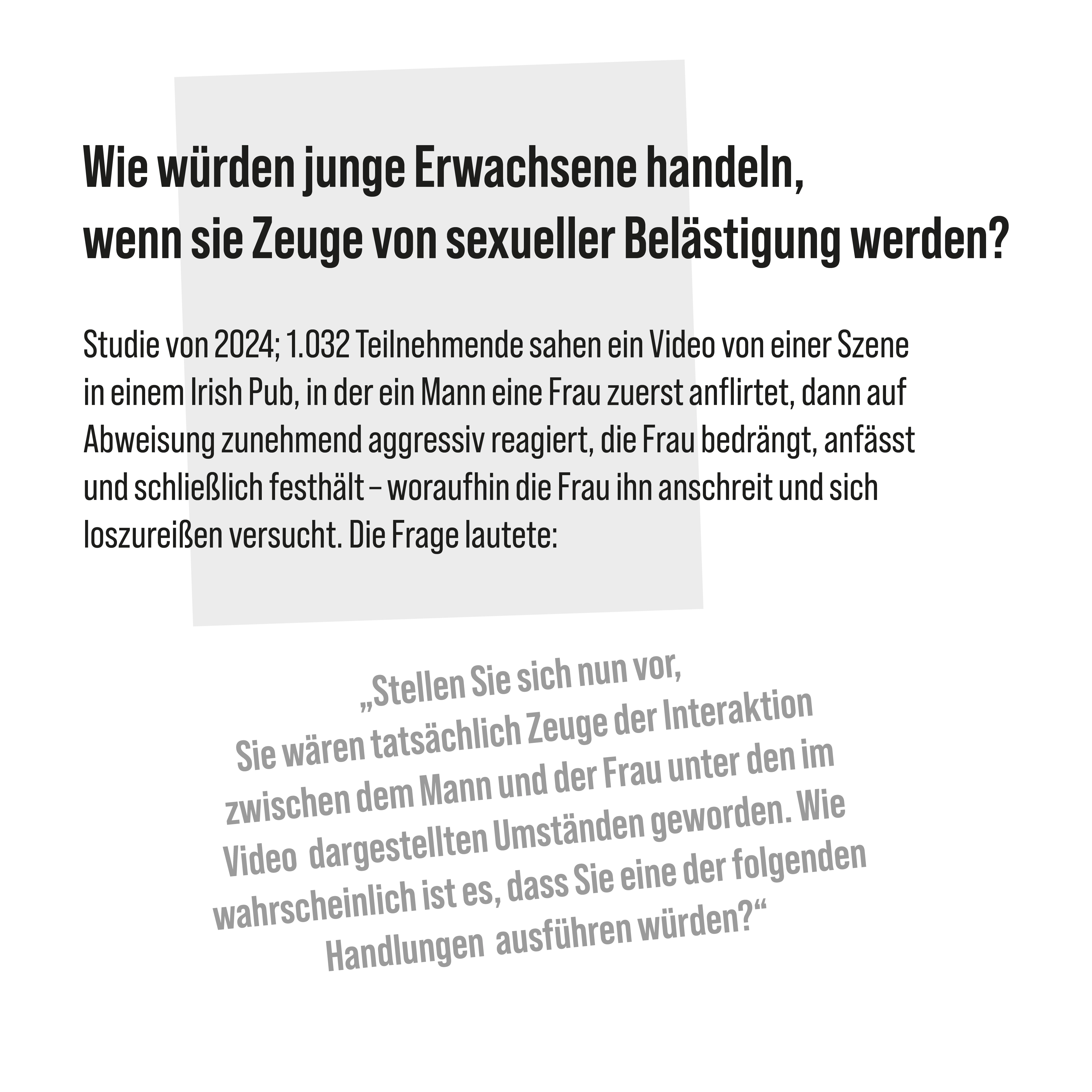 In einer Bar kommt es zu einem sexuellem Übergriff. Wer reagiert? Wie? Und warum? Die Antwort darauf ist komplex, zeigt eine neue Studie eines internationalen Forschungsteams. Dafür wurde den Teilnehmenden auf Video eine nachgestellte Szene gezeigt, in der eine Frau in einem Irish Pub von einem Mann bedrängt wird. Die Proband:innen wurden gefragt, ob sie abwarten, Hilfe holen oder mit Worten oder körperlich eingreifen würden.