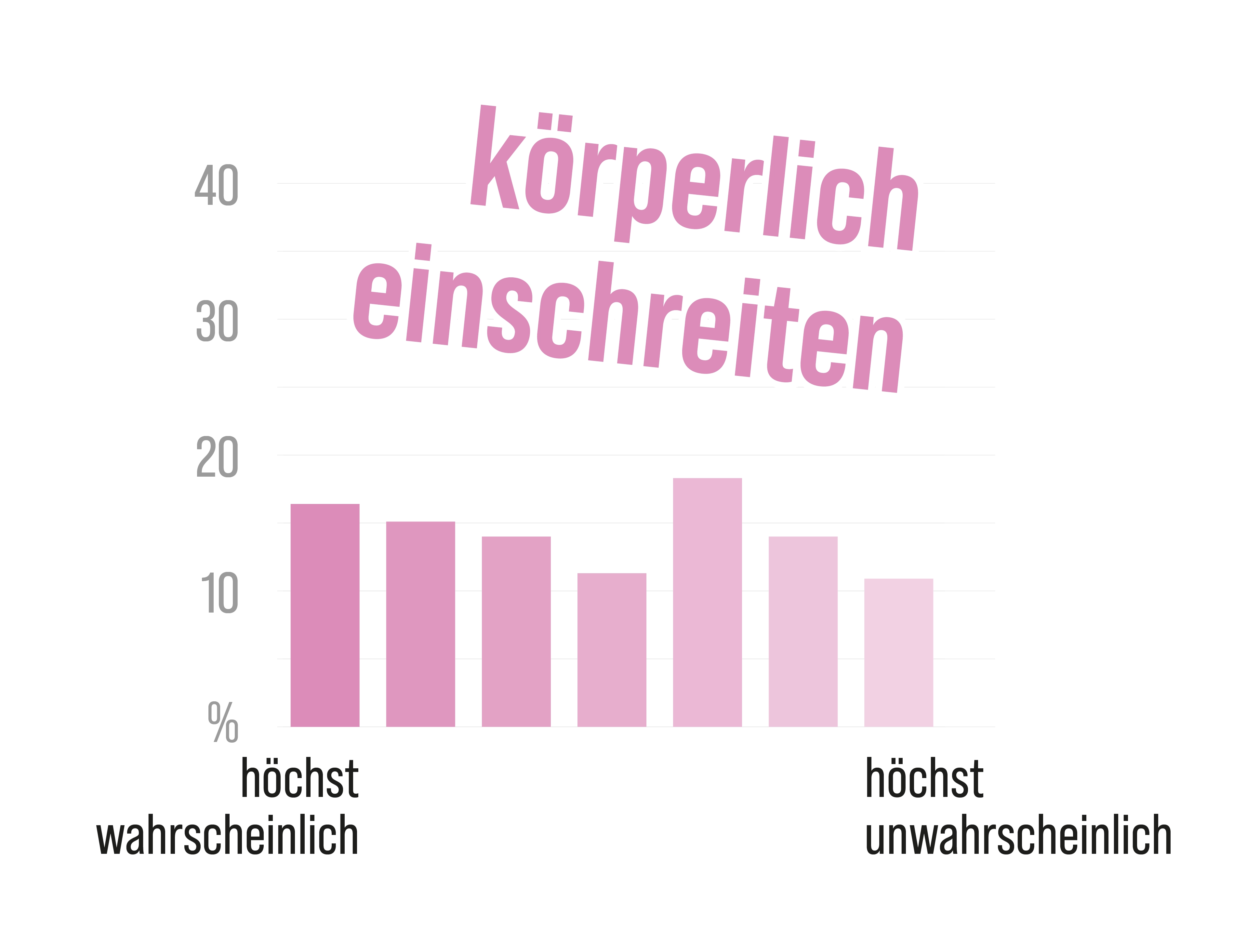 Aber auf welche Art greifen die Zeugen ein? „Indirekt“, indem sie Hilfe holen, oder „direkt“, indem sie selbst verbal oder körperlich aktiv werden? Menschen, die ähnliche Situationen schon einmal mit- oder selbst erlebt haben, sind eher bereit, direkt einzugreifen. Und: Je stärker die Teilnehmenden der Überzeugung sind, dass andere in der Bar einschreiten würden, desto eher sind sie auch selbst bereit dazu. Genauso würden sie eher handeln, wenn sie sich selbst als körperlich stark einschätzen.